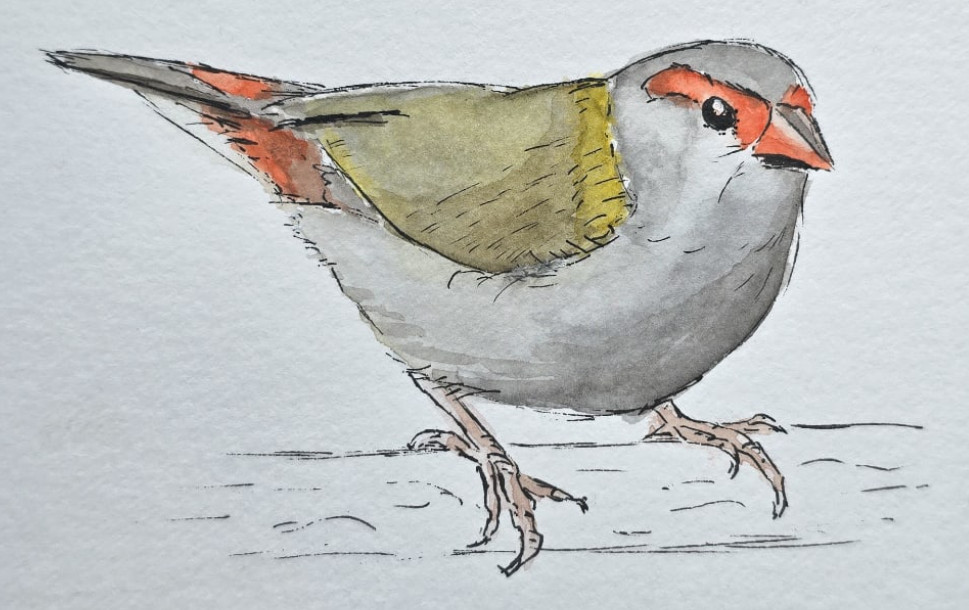 A lovely rendering of the Red-browed Finch by Linda. One of those little birds that never stops and always looks busy. Too busy to have a drink at our water bowl and pose for the camera…