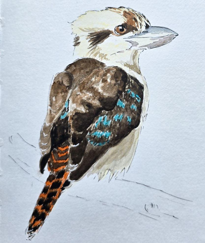 Last but not least in Linda’s series of Australian bird drawings, an Australian icon. We see them often on our washing line, spying for a worm or other delicacy. The Kookaburra’s call is iconic and hard to miss. They don’t come for a drink, so I haven’t captured one on the camera yet…